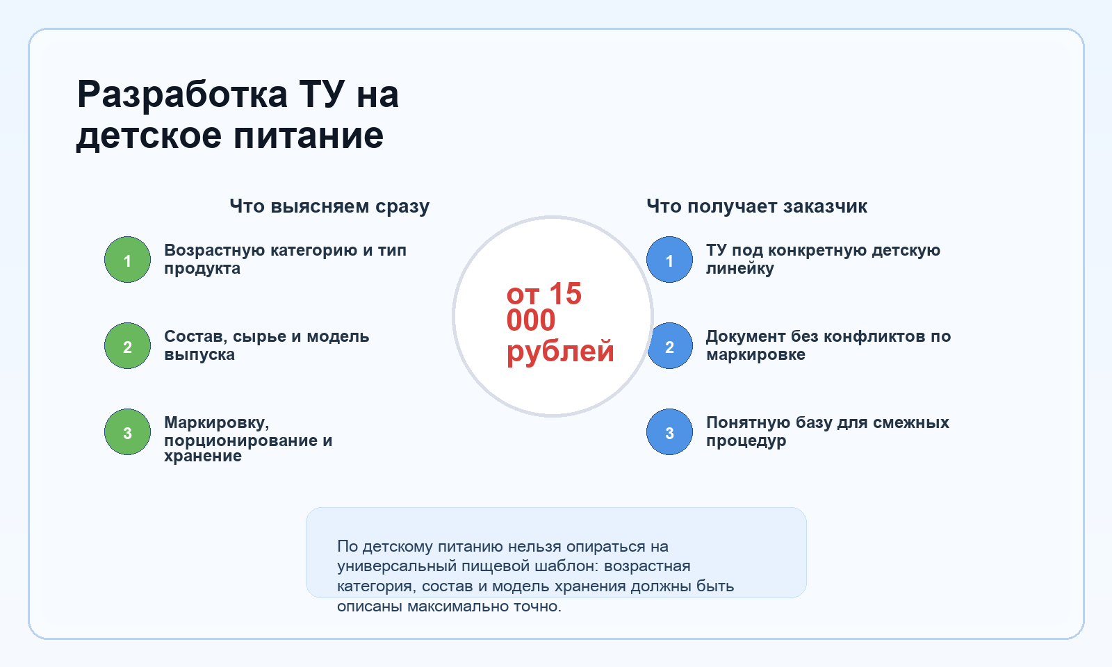 Отдельное ТУ по детскому питанию нужно тогда, когда предприятие хочет описать конкретный продукт аккуратно и без риска, что документ окажется слишком общим для такой чувствительной категории.
