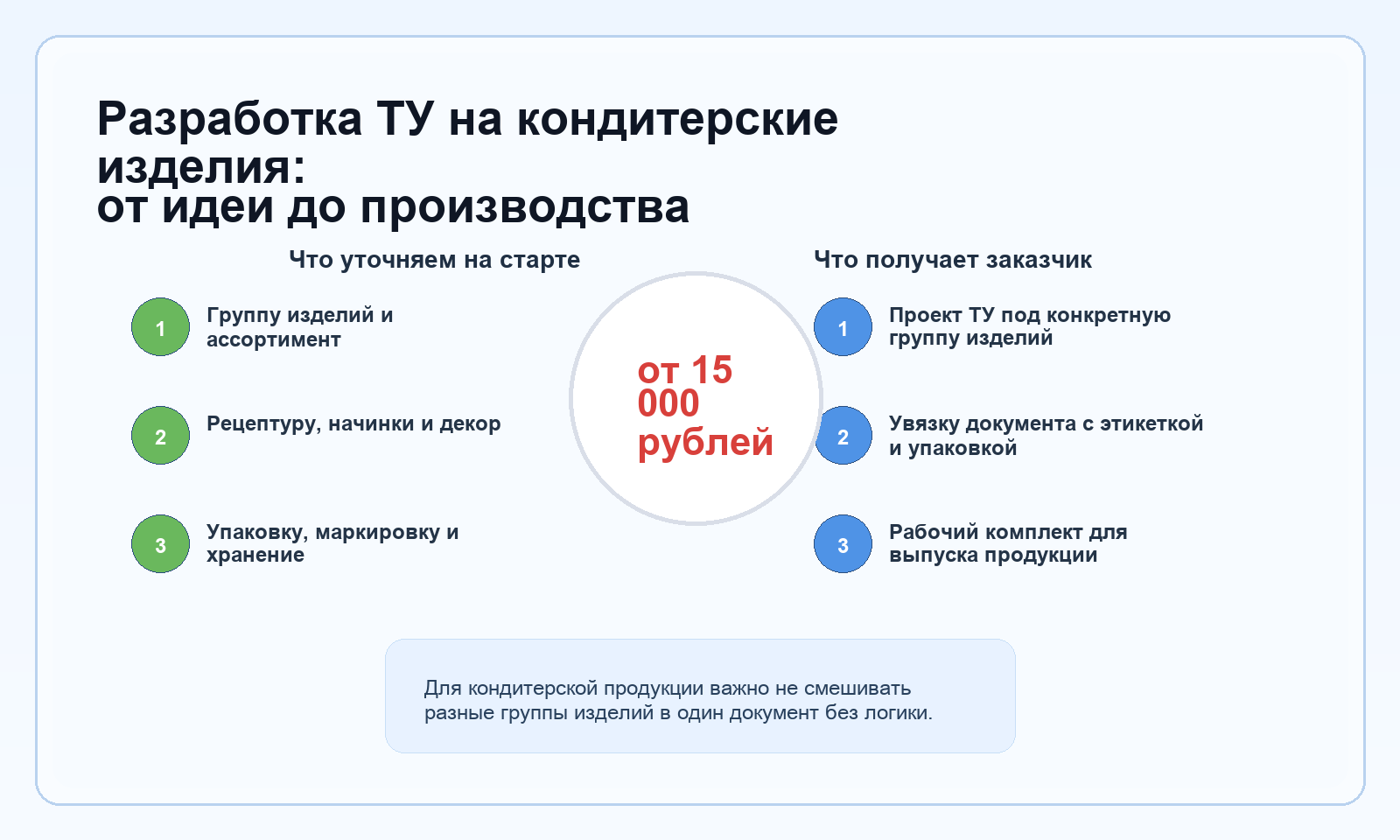Оставьте заявку на разработку ТУ на кондитерские изделия. Мы быстро оценим, нужен ли отдельный документ, скажем, можно ли объединить ассортимент в одном ТУ, и подскажем, каких исходных данных не хватает для старта.
