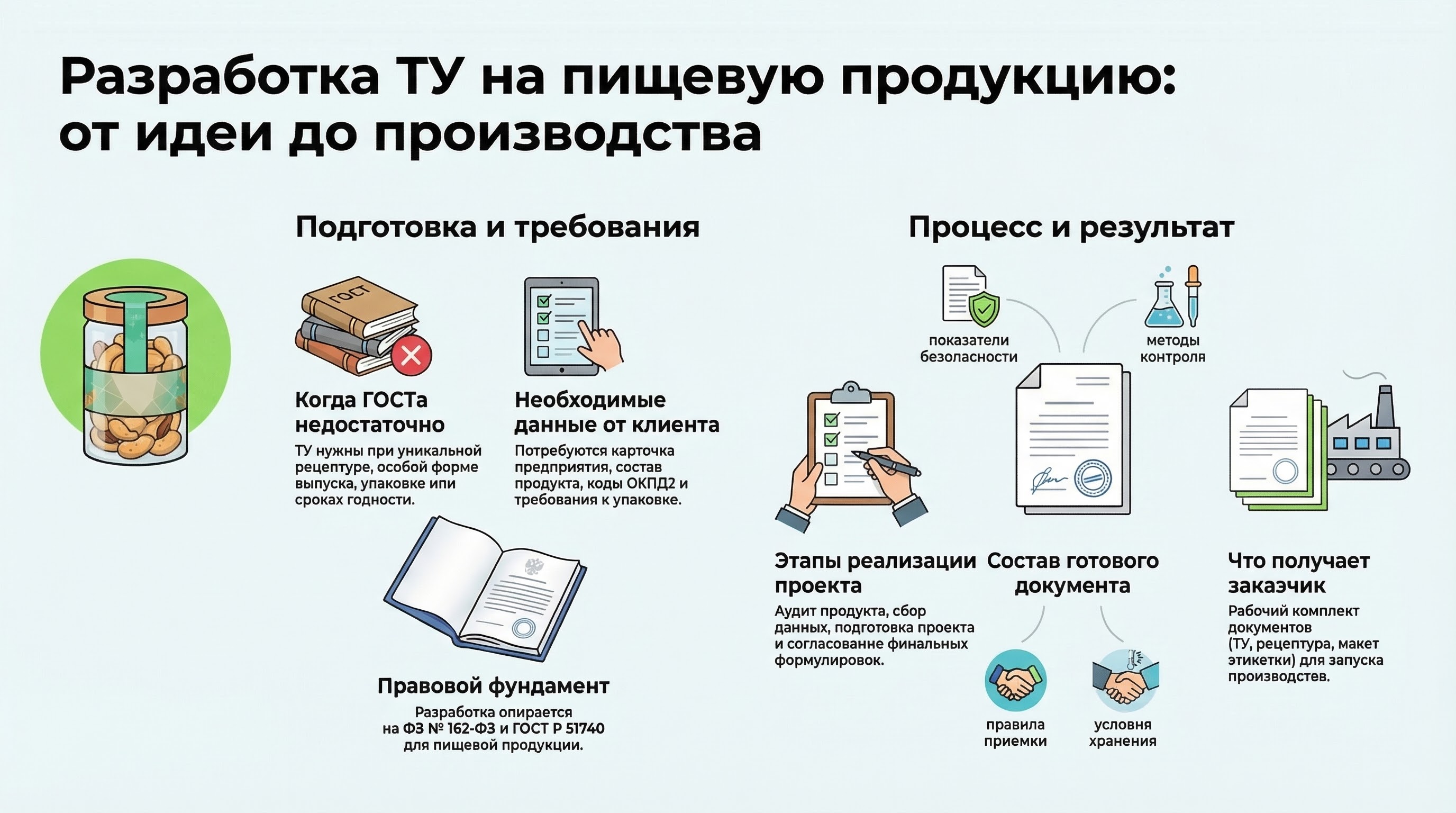 Технические условия на пищевую продукцию нужны не во всех случаях. Если для товара уже есть действующий стандарт и он полностью закрывает характеристики вашей продукции, отдельные ТУ могут не потребоваться. Но когда нужно закрепить собственную рецептуру, особые требования к упаковке, маркировке, контролю, хранению или сроку годности, ТУ становятся рабочей основой для выпуска продукции.